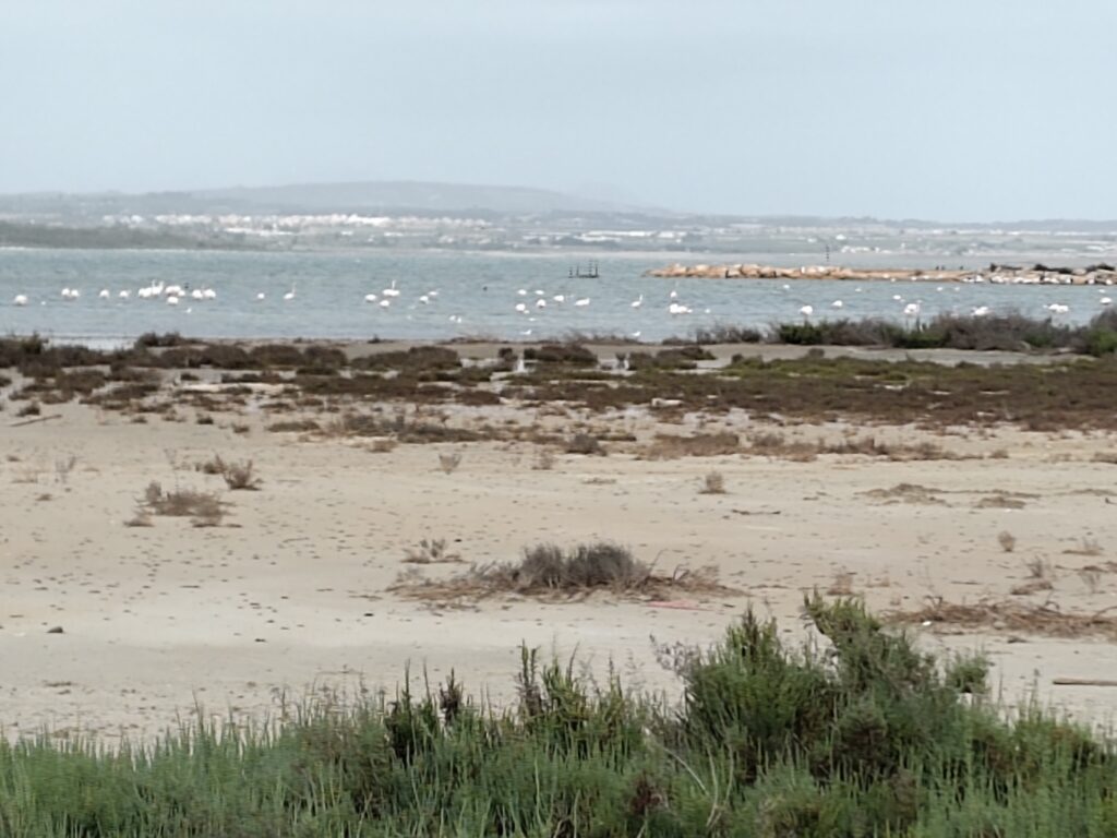 In Torrevieja vonden we een terrasje uit de wind voor koffie en appeltaart. We liepen Torrevieja weer uit en kwamen in een natuurgebied La Mata met grote binnenmeren en heel veel flamingo’s.