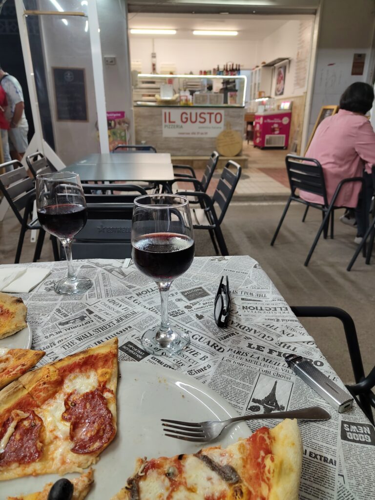 Op de dag van aankomst lagen we heerlijk in de najaarszon. We aten een superpizza in een leuke sfeer bij een van de straatjes achter de touristische strip. Een paar tafeltjes op straat en dat was het. Heel leuk en vooral echt lekker!